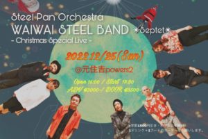 さらに詳しく »トリニダード・トバゴで生まれた楽器・スティールパンを通して独自のスタイルで追求する音楽を「WAIWAIミュージック」と提唱するWAIWAI STEEL BAND。2008年結成、世代とルーツを超え、よりソリッドなサウンドを貫く13人のメンバーが集結。突き抜ける多幸感と躍動感に溢れた音楽を世に解き放つ!今回は7人編成にてクリスマス・スペシャルライブ開催決定!!…