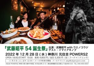 さらに詳しく »★武藤昭平54誕生祭★ 2022/12/28(水)@元住吉POWERS2 OPEN 18:00/START 19:30 ADV¥4800/DOOR¥5300 1ドリンク+1フードのオーダーをお願いします。 ■LIVE 武藤昭平withウエノコウジ ゲスト:イマイアキノブ ■チケット予約方法 メール予約受付:11月5日(土)正午12:00~ メールアドレス …