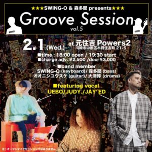 漆黒ミュージシャンSWING-Oと森多聞が組んでスタートしたライブイベント"Groove Session"のvol.5が決定!フィーチャリングボーカルは、前回に続きUEBOとJAY'ED、今回はさらにスガシカオのコーラスなどで活躍するJUDY.も加わり、さらに濃厚SOULな夜になることが決定!! ★SWING-O & 森多聞 presents Gro…