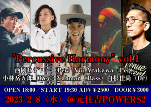 さらに詳しく »"Percussive Harmony" vol.1 西岡ヒデローとYuiの発案によるセッションの第一回目。ドラムに白根佳尚、ベースにヤーマン、キーボードに小林岳五郎を迎え織りなすリズムとハーモニーの実験室。初めてのキャスティングが起こすケミストリーは予測不可能! ★Percussive Harmony vol.1★ 2023/2/8(水)@元住吉POWER…