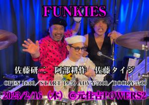 さらに詳しく »シアターブルックの佐藤タイジ、マルコシアス・バンプの佐藤研二、元THE COLLECTORSの阿部耕作によるFUNKIESワンマンLIVE開催決定!珠玉の名曲の数々をファンキーに再現します!中毒者続出中☆ ★FUNKIES〜佐藤タイジ+佐藤研二+阿部耕作★ 2023/2/16(木)@元住吉POWERS2 OPEN 18:00/START 19:30(2SET…