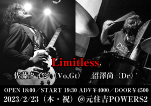 さらに詳しく »ロックスター佐藤タイジとGROOVEドラマー沼澤尚による ”Limitless” 開催決定!正解も限界もないのがアートの面白さであり、音楽は無限である。お見逃しなく! ★Limitless〜佐藤タイジ+沼澤尚★ 2023/2/23(木・祝)@元住吉POWERS2 OPEN 18:00/START 19:30 ADV¥4000/DOOR¥4500 1ドリンク+…
