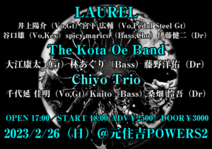 さらに詳しく »ありとあらゆる音楽シーンで活躍中のメンバーによる新進気鋭のオルタナカントリーバンドLAURELと若手スライドギターの名手・大江康太率いるThe Kota Oe Band、POWERS2スタッフの千代延率いるChiyo Trioによるスライド祭りなスリーマン開催決定!お楽しみに☆ ★LAUREL × The Kota Oe Band × Chiyo Trio★…