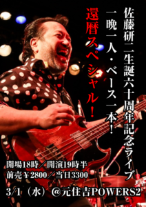 マルコシアス・バンプのベーシスト佐藤研二、生誕60周年記念ライブ開催決定!一晩一人・ベース1本!インストあり歌モノあり、もちろん超絶トークもあり!還暦だよ全員集合〜お楽しみあれ☆ ★還暦 special 第一弾:佐藤研二生誕60周年記念ライブ〜還暦だよ全員集合!★ 2023/3/1(水)@元住吉POWERS2 OPEN 18:00/START 19:30 A…