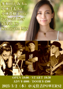 さらに詳しく »数々のメジャーアーティストのアレンジやサポートで大活躍中のキーボーディストGakushi、CHOZEN LEE and THE BANG ATTACK等で活躍する小林洋太と小林眞樹、世界が認めたGROOVEドラマー沼澤尚、スーパーMIXエンジニアKamiyann、そしてシンガーソングライター多和田えみによるスペシャルLIVE開催決定!お楽しみに☆ ★多和田え…