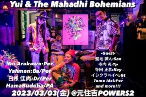 さらに詳しく »Yui & The Mahadhi Bohemians パーカッショニストYui Arakawaが中心となり、ドラムに 白根佳尚、ベースに Yahman をサウンドの軸として迎え、長年Yuiのパーカッションサウンドを支えているエンジニアHamaBuddhaを交えて始動したプロジェクト。 大地が揺らぐBeatを中心にアフリカンバティックのようなカラフル…