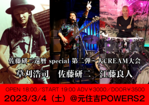 さらに詳しく »マルコシアス・バンプのベーシスト佐藤研二還暦 special 第二弾は大CREAM大会!とゆーことでCREAMの名曲の数々を惜しみなくお届けします!CREAM好き大集合☆ ★佐藤研二還暦 special 第二弾:大CREAM大会〜佐藤研二+草刈浩司+江藤良人★ 2023/3/4(土)@元住吉POWERS2 OPEN 18:00/START 19:00 ADV…