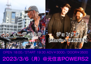 さらに詳しく »ある時は重金属打楽器奏者、またある時は原ハブ屋奄美 公認はぶ大使として知られるパーカッショニスト・スティーヴ エトウ、OAUのマーティンとカクエイによるユニット”ジョンタナ”のツーマンライブ開催決定!もちろんスペシャルセッションも!お楽しみに☆ ★スティーヴ エトウ × ジョンタナ from OAU★ 2023/3/6(月)@元住吉POWERS2 OPEN …