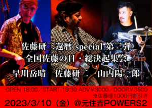 さらに詳しく »マルコシアス・バンプのベーシスト佐藤研二還暦 special 第三弾は佐藤研二+早川岳晴+山内陽一郎によるツイン・エレキベース×ドラムの重低音ブリブリでお届けします!さらに全国佐藤の日・総決起集会とゆーことで佐藤様1000円割引き☆ ★佐藤研二還暦 special 第三弾:全国佐藤の日・総決起集会〜佐藤研二+早川岳晴+山内陽一郎★ 2023/3/10(金)@…