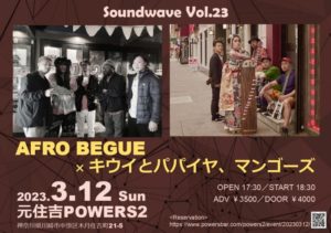 さらに詳しく »Afro Begue presents Soundwave Vol.23開催! 今回のゲストは、トロピカルダンス歌謡バンド・キウイとパパイヤ、マンゴーズ! Afro BegueとKPMと一緒に世界一周! 2023年も一緒に踊って笑っていきましょ! ★Afro Begue presents Soundwave vol.23★ 2023/3/12(日)@元住吉P…