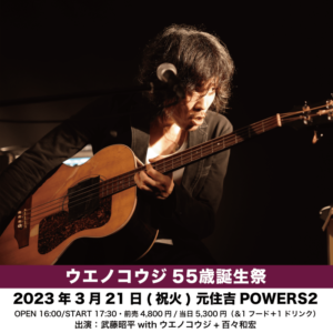 さらに詳しく »「ウエノコウジ55歳誕生祭」 2023年3月21日(祝・火)元住吉POWERS2 OPEN 16:00/START 17:30 前売4,800円/当日5,300円(&1フード+1ドリンク) ■出演 武藤昭平 with ウエノコウジ+百々和宏 ■TICKET&INFO ◎メール予約受付:1月21日(土)正午12:00~ メール ukp@ukprojec…