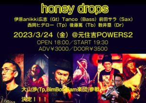 さらに詳しく »Venue Vicentの伊原Anikki広志と西岡ヒデロー、HOME GROWNのTancoとモミーFUNK!の数井塁による最強リズムセクションに、漢気ムキムキ後藤篤、そして紅一点でもプレイは超おっとこ前だの前田サラによるhoney dropsワンマンLIVE!スペシャルゲストにBimBomBam楽団の大山渉(Tp)参戦決定!お楽しみに☆ ★honey d…