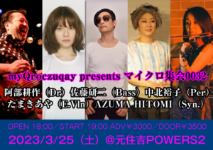 さらに詳しく »myQroczuqay presents マイクロ集会0032開催決定!今回も素晴らしいメンバーと共にスーパーセッションと爆笑トークをお届けします!女子率高めです!お楽しみに☆ ★myQroczuqay presents マイクロ集会0032★ 2023/3/25(土)@元住吉POWERS2 OPEN 18:00/START 19:00 ADV¥3000/D…
