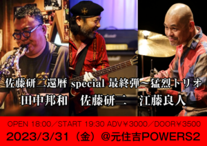 さらに詳しく »マルコシアス・バンプのベーシスト佐藤研二還暦 special 最終弾は唯一無二のSax奏者・田中邦和とジャズドラマー江藤良人による猛烈トリオ!超絶ライブ&爆笑トークで猛烈にゴキゲンな一夜をお約束します☆ ★佐藤研二還暦 special 最終弾:猛烈トリオ〜佐藤研二+田中邦和+江藤良人★ 2023/3/31(金)@元住吉POWERS2 OPEN 18:00/S…