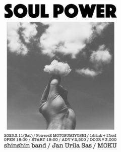 さらに詳しく »昨年末に初のシングル「pipipi / おぼろげ」を配信リリースしたshinshin bandがPOWERS2初登場!話題沸騰中の四人組moku、jan and naomiのJan Urila Sasと共に「SOUL POWER」開催します!お楽しみに☆ ★SOUL POWER★ 2023/3/11(土)@元住吉POWERS2 OPEN 18:00/STAR…