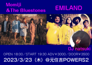 さらに詳しく »若手最注目BLUESシンガー大久保紅葉率いるMomiji & The Bluestonesと元ズクナシのEMI率いるEMILANDによる超アッパーかつウーマンなツーマンLIVE開催決定!SOUL、R&B、BLUES好き必見です!お見逃しなく☆ ★Momiji&The Bluestones × EMILAND × DJ natsuki★ 202…