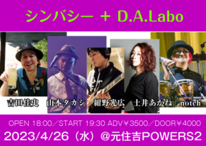オンライン呑みトーク配信、Barよしふみ 2号店 「シンバシー」からさらに派生したライブ「シンバシー + D.A.Labo」開催決定!5人のセッションとトークをお楽しみに! ★シンバシー + D.A.Labo★ 2023/4/26(水)@元住吉POWERS2 OPEN 18:00/START 19:30 ADV¥3500/DOOR¥4000 1ドリンク+1…