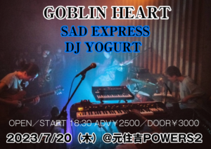 さらに詳しく »★GOBLIN HEART★ 2023/7/20(木)@元住吉POWERS2 OPEN/START 18:30 ADV¥2500/DOOR¥3000 1ドリンク+1フードのオーダーをお願いします。 ■LIVE SAD EXPRESS 宮崎良研(Gt) 金子声児(Bass) 坂本大季(Dr) 山田碧(Key,Trb) 髙島連(sax) ■DJ YOGURT(…