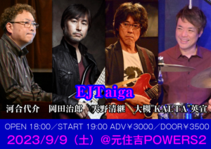 さらに詳しく »大槻"KALTA"英宣を中心にメンバーのオリジナル曲、ウェザー・リポートやイエロージャケッツのカヴァー、ジョー・ザヴィヌル トリビュートなどなど、激アツ選曲でクロスオーバーします!必見必聴!! ★EJTaiga〜大槻"KALTA"英宣+河合代介+天野清継+岡田治郎★ 2023/9/9(土)@元住吉POWERS2 OPEN 18:00/START 19:00 …